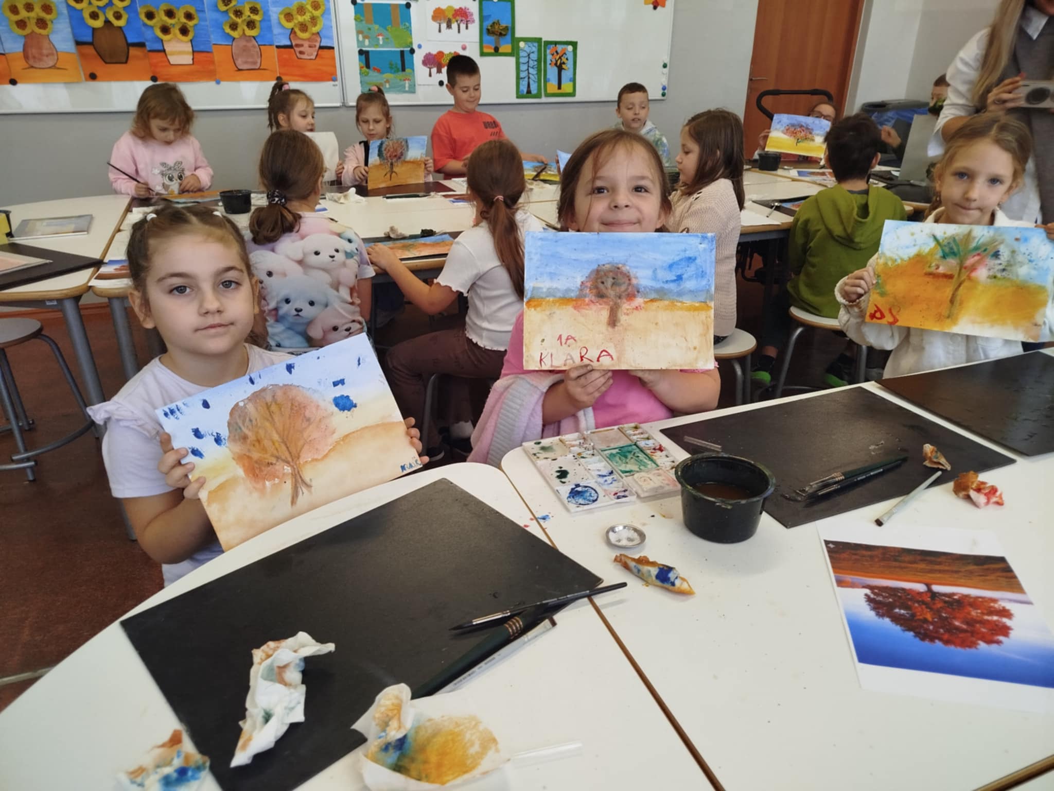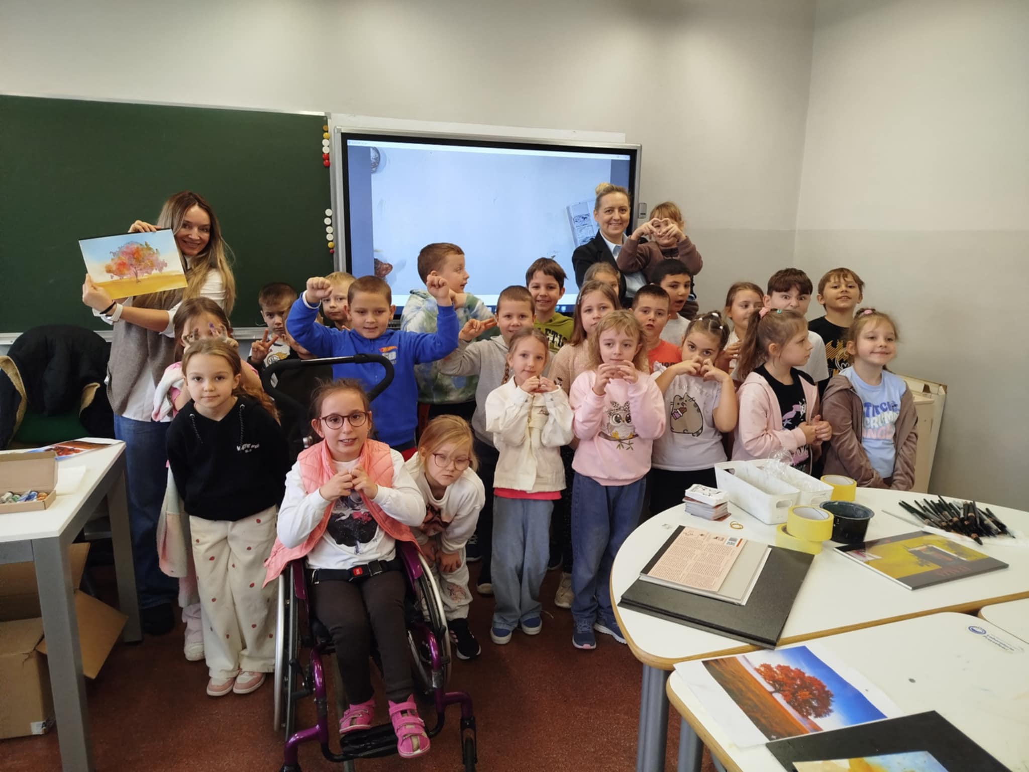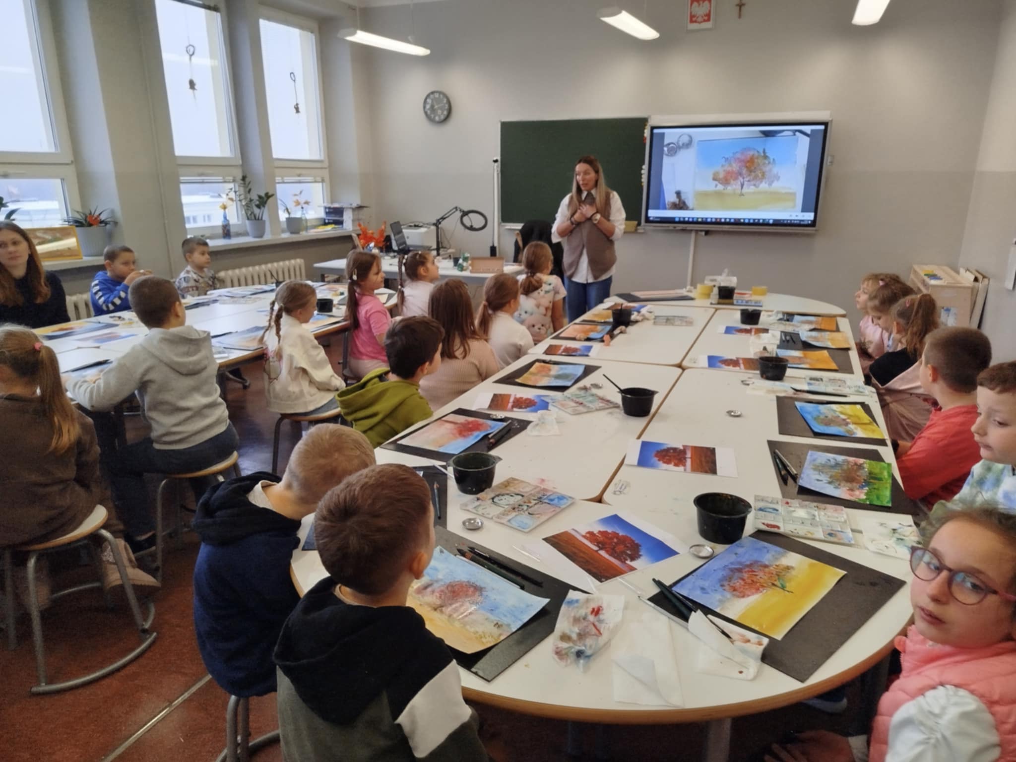 25 listopada w klasie 1a odbyły się wyjątkowe warsztaty plastyczne z panią Iwoną Karoń-Jarzyńską, realizowane w ramach programu "Cztery pory roku z akwarelą" - pierwszy etap: Jesień. Pani Iwona, laureatka wielu nagród artystycznych, znana ze swojej wrażliwości twórczej i profesjonalnego podejścia do dzieci, z ogromnym zaangażowaniem poprowadziła zajęcia. Pod jej czujnym okiem uczyliśmy się podstaw malowania akwarelą, poznawaliśmy techniki pracy z farbą i odkrywaliśmy, jak wiele można wyrazić za pomocą delikatnych, wodnych barw. Dziękujemy pani Iwonie za poświęcony czas, dzielenie się wiedzą, doświadczeniem i pasją, która z pewnością zainspiruje naszych małych artystów do dalszej twórczej przygody!