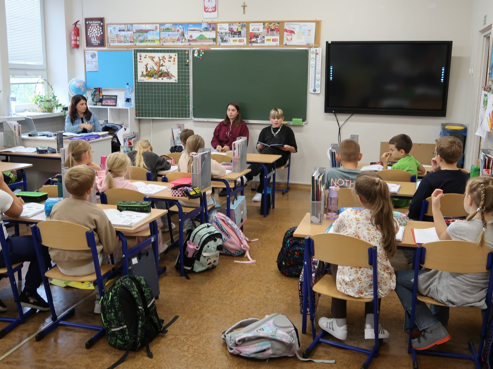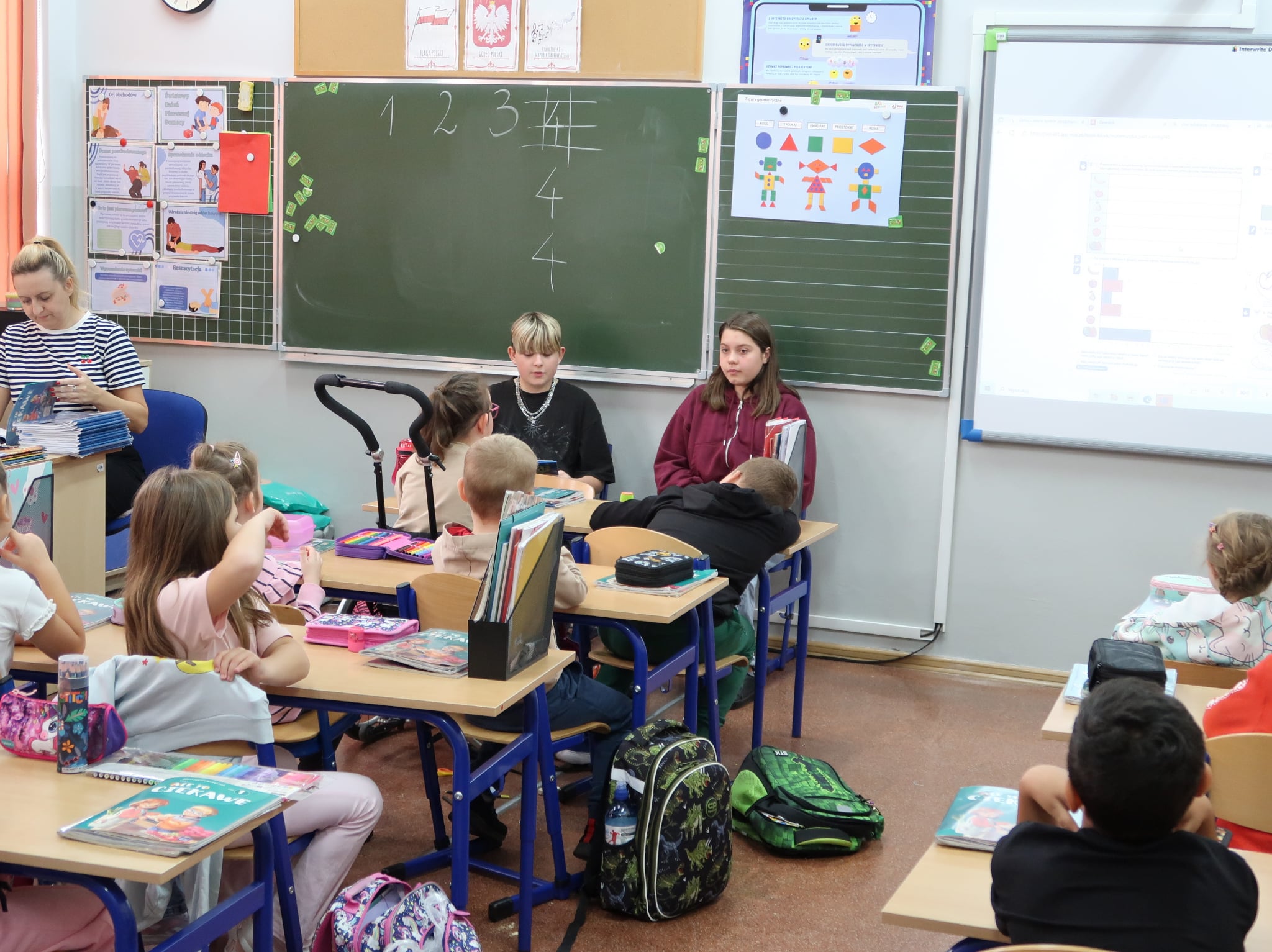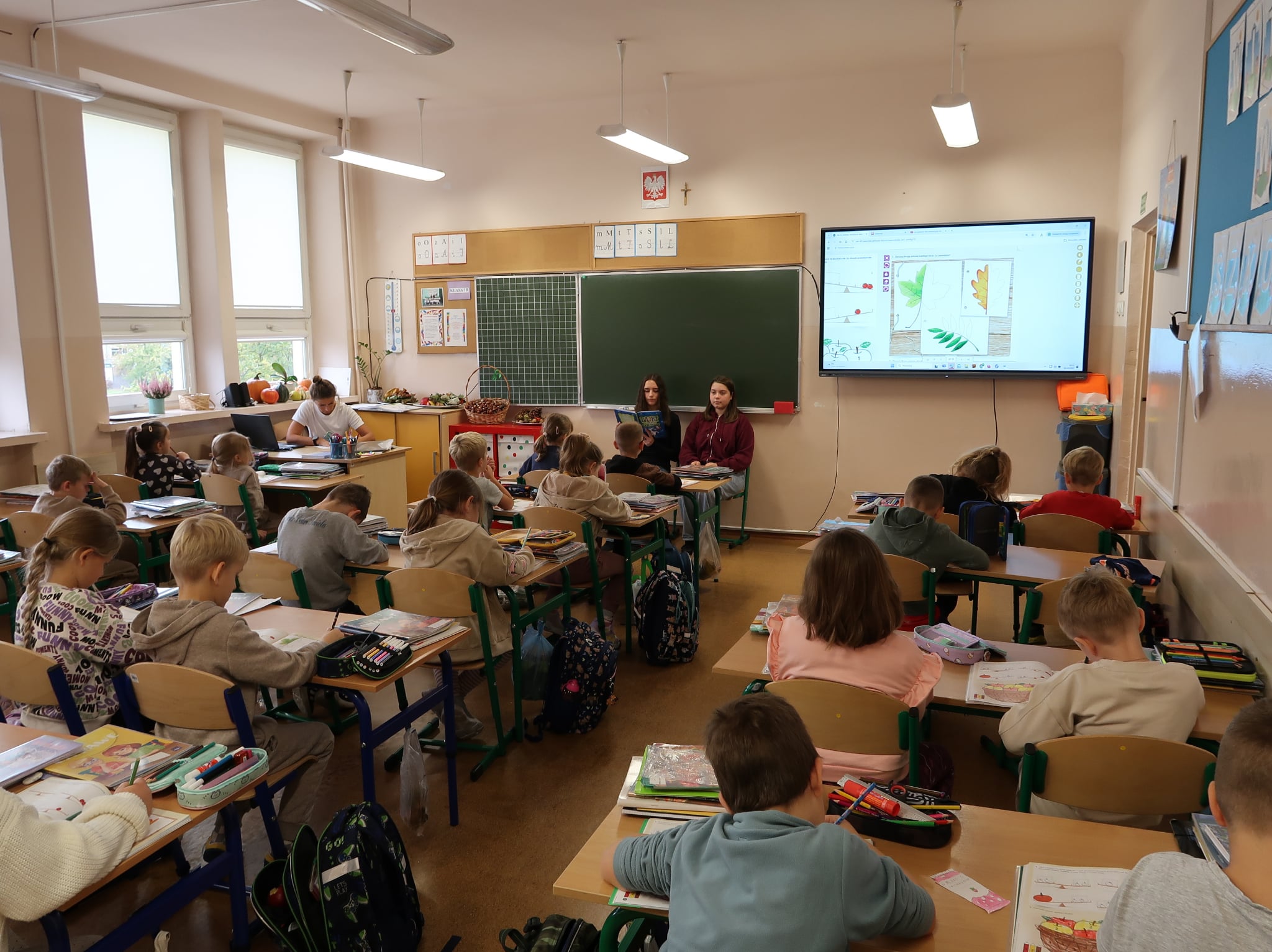 Nasi uczniowie: Julia Słotwińska, Alicja Wróblewska i Aleks Malicki z 7b wraz z nauczycielem bibliotekarzem odwiedzili najmłodszych uczniów w naszej klasie. Dzieci wysłuchały „Mądrych Bajek” z przesłaniem, zarówno dla dziewczynek, jak i dla chłopców, odpowiadali na zadane przez starszych kolegów pytania. Zostali zachęceni do czytania i korzystania z biblioteki, w tym szkolnej. h.g