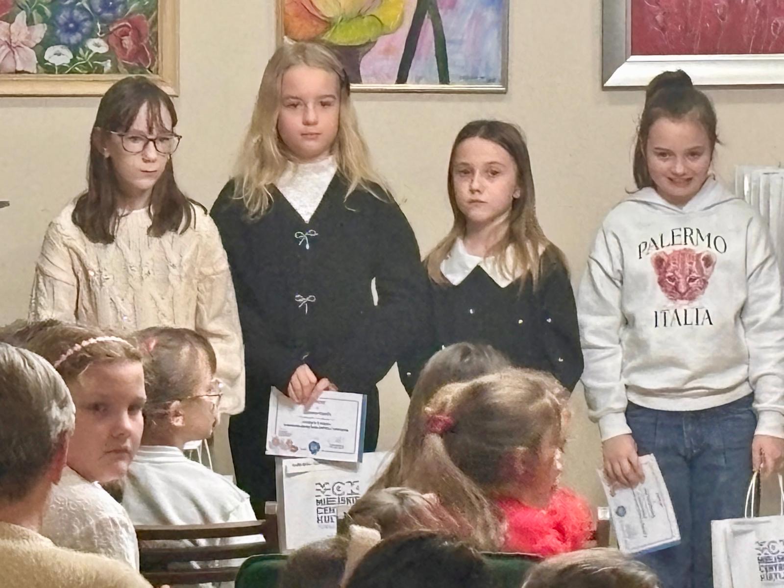 W Miejskim Centrum Kultury odbyło się uroczyste podsumowanie Powiatowego Konkursu Plastycznego „Kartka z aniołkiem”. W gronie laureatów i wyróżnionych znalazła się silna reprezentacja naszej szkoły. I miejsce zajęły Julia Radomska z klasy 2b oraz Helena Kłoś i Oliwia Strąk z 3a, II miejsce przypadło Lilianie Pietruszce i Klarze Radziwoniuk z 3a, III miejsce zajęły Kaja Zakrzewska z 2b oraz Klaudia Borowska, Pola Kozar i Zuzanna Pawlik z 3a, wyróżnienia otrzymały Iza Arndt i Laura Stańdo z 3a. Brawo dziewczyny!