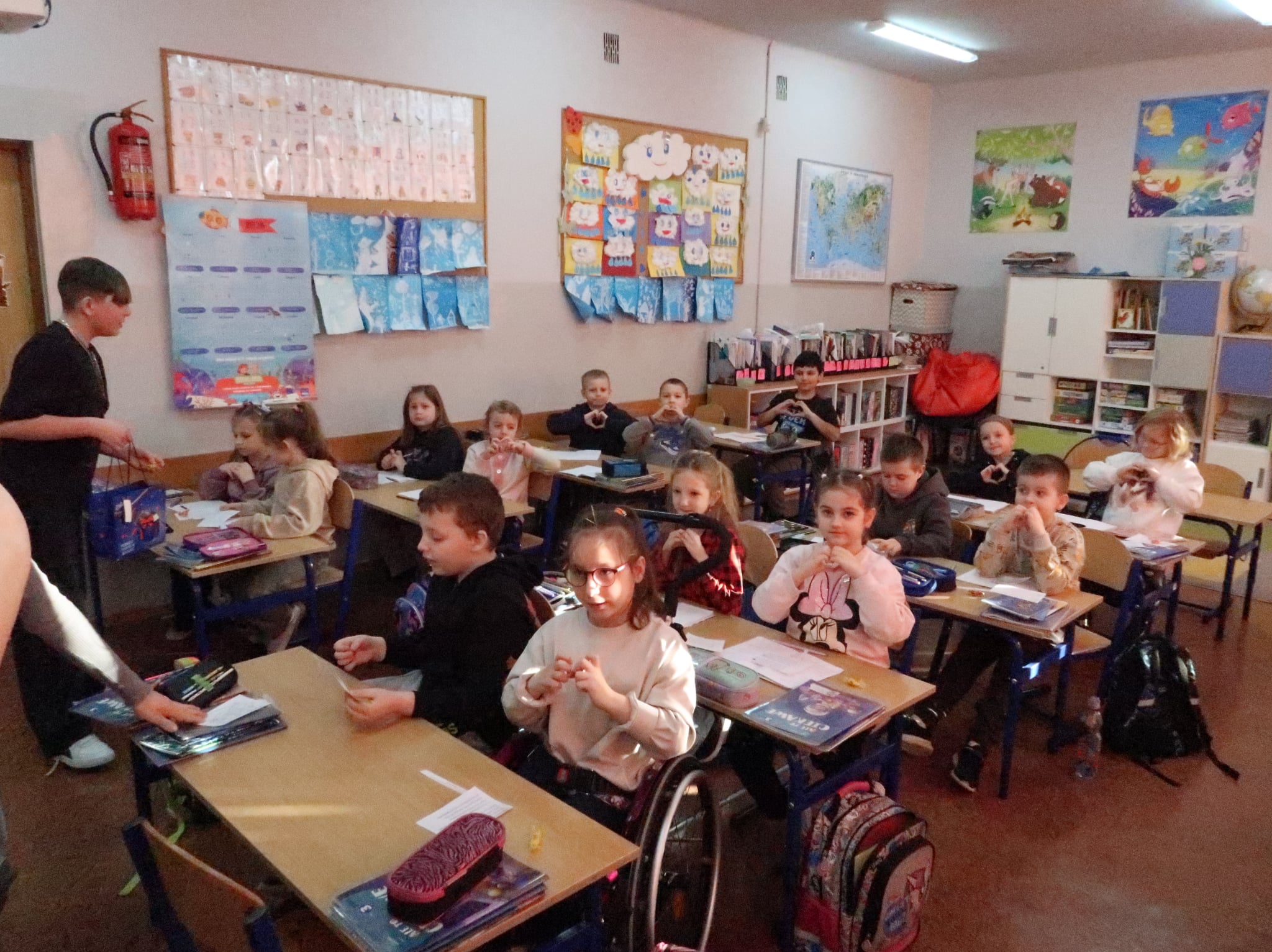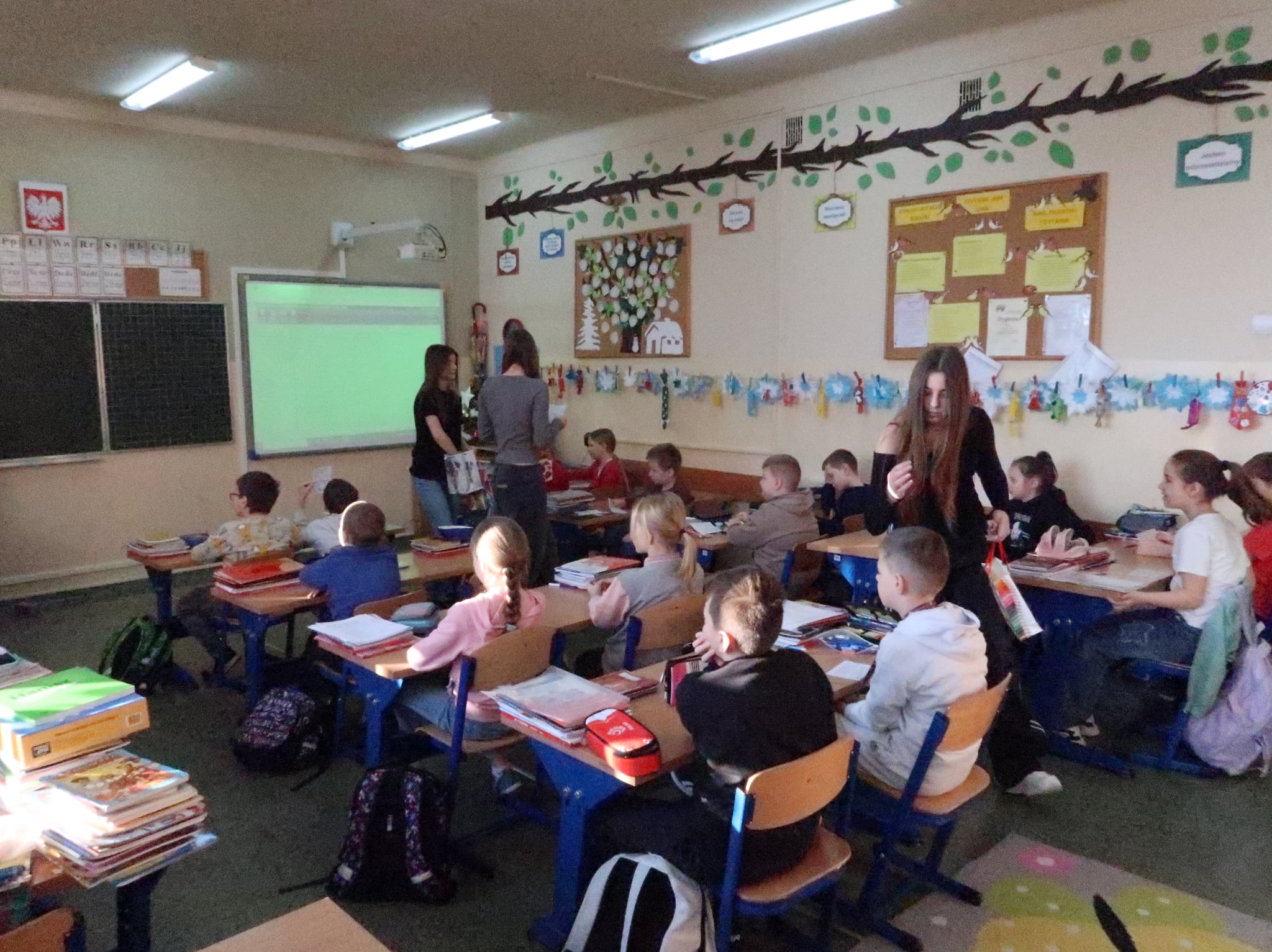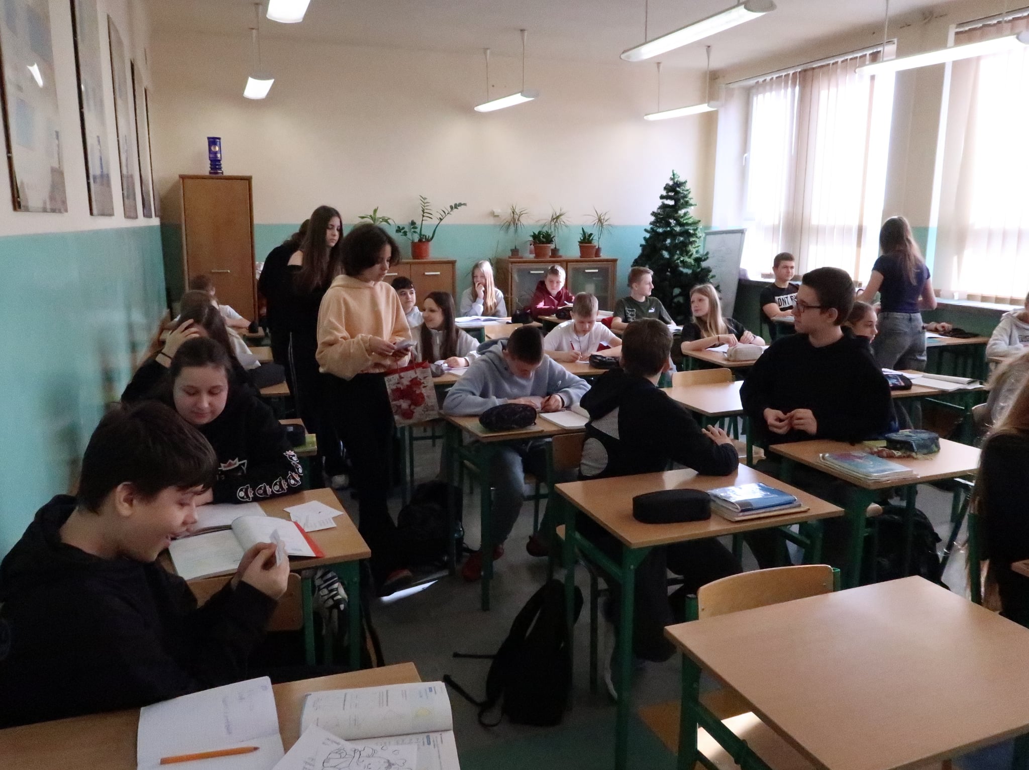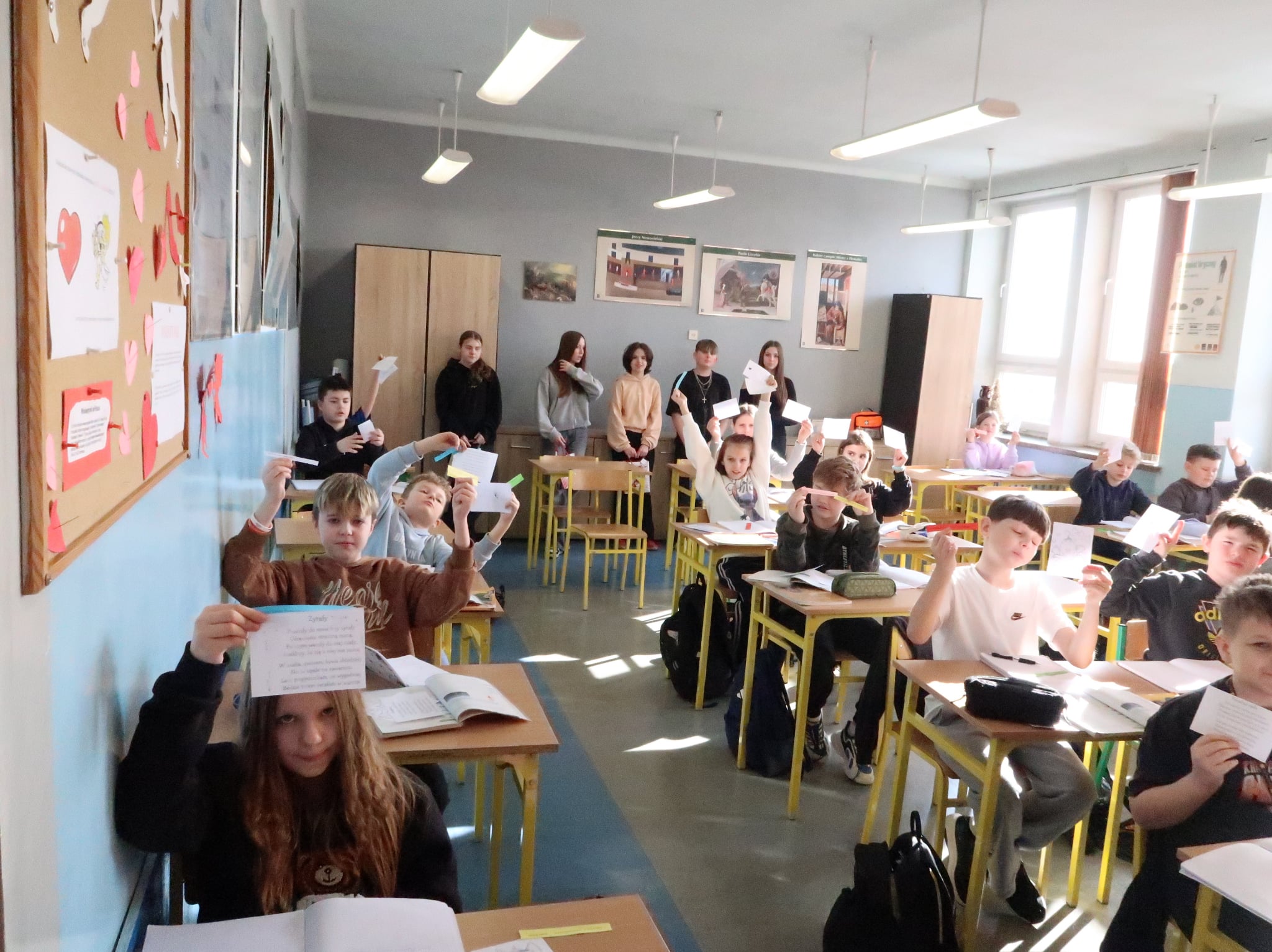 Po feriach, 16 lutego aktyw biblioteczny: Zuzanna Chojnacka z 6a, Aleks Malicki, Lena Sej, Hanna Gawron i Wiktoria Jarzębska z 7b, Karolina Kleszcz i Joanna Świnoga z 7a wraz z n-lem bibliotekarzem odwiedzili wszystkich uczniów, nauczycieli i pracowników, każdy dostał jakiś upominek: tematyczny cytat, zagadkę, wiersz trenujący wymowę, walentynkę, słodycz.