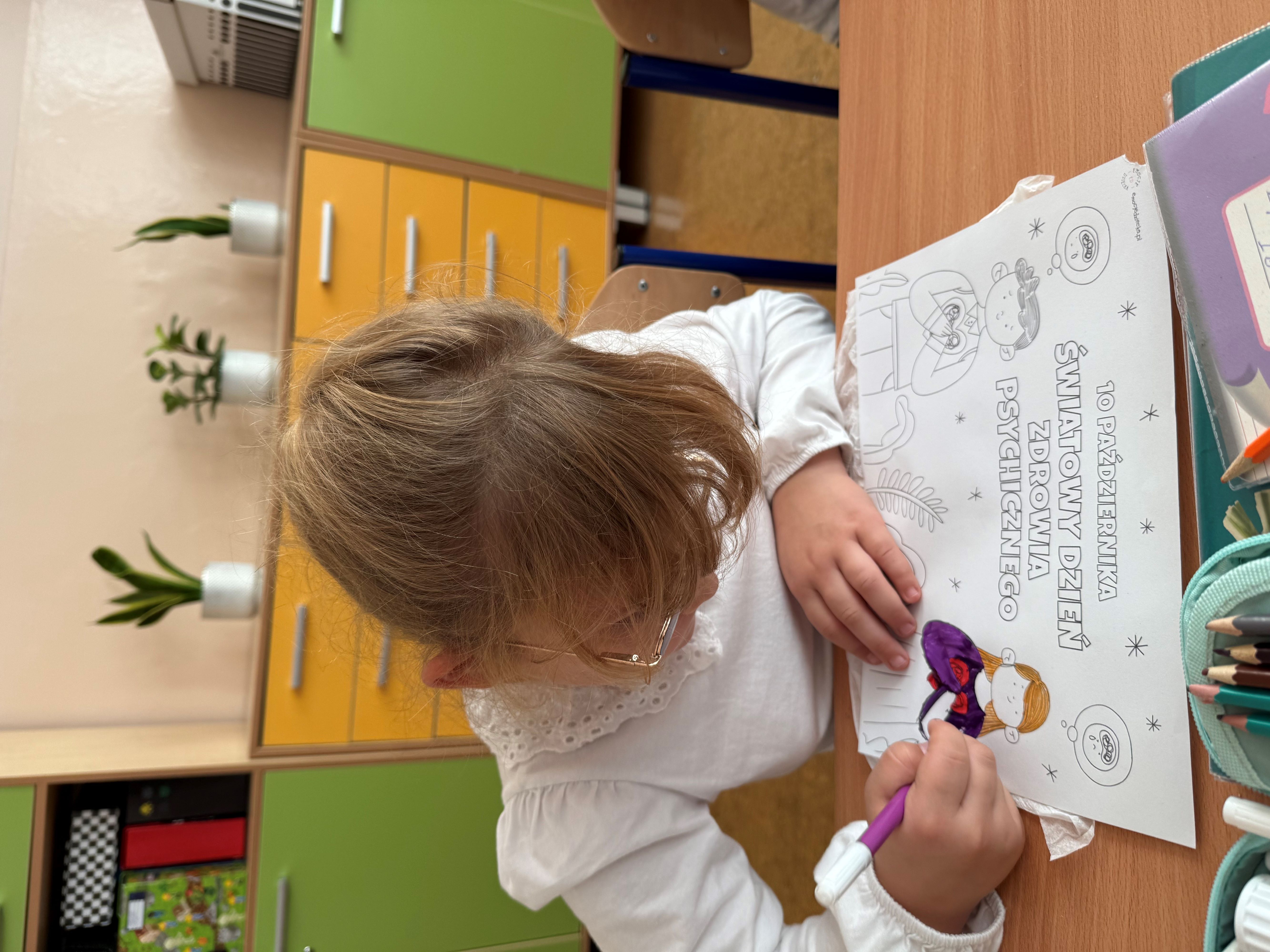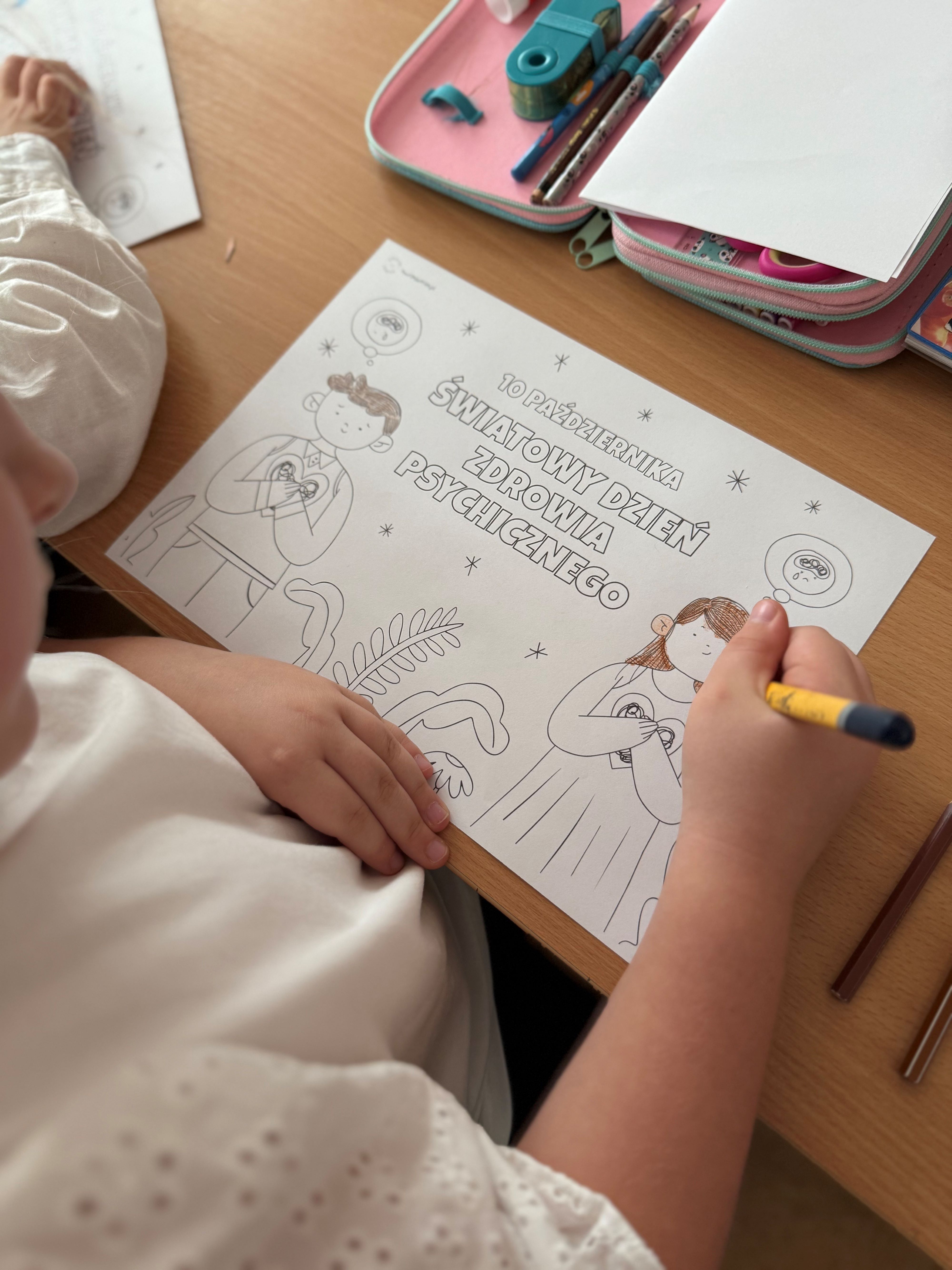 Na zakończenie zajęć dzieci wykonały kolorowankę pod hasłem „Światowy Dzień Zdrowia Psychicznego”, utrwalając w ten sposób zdobytą wiedzę i promując troskę o siebie nawzajem.