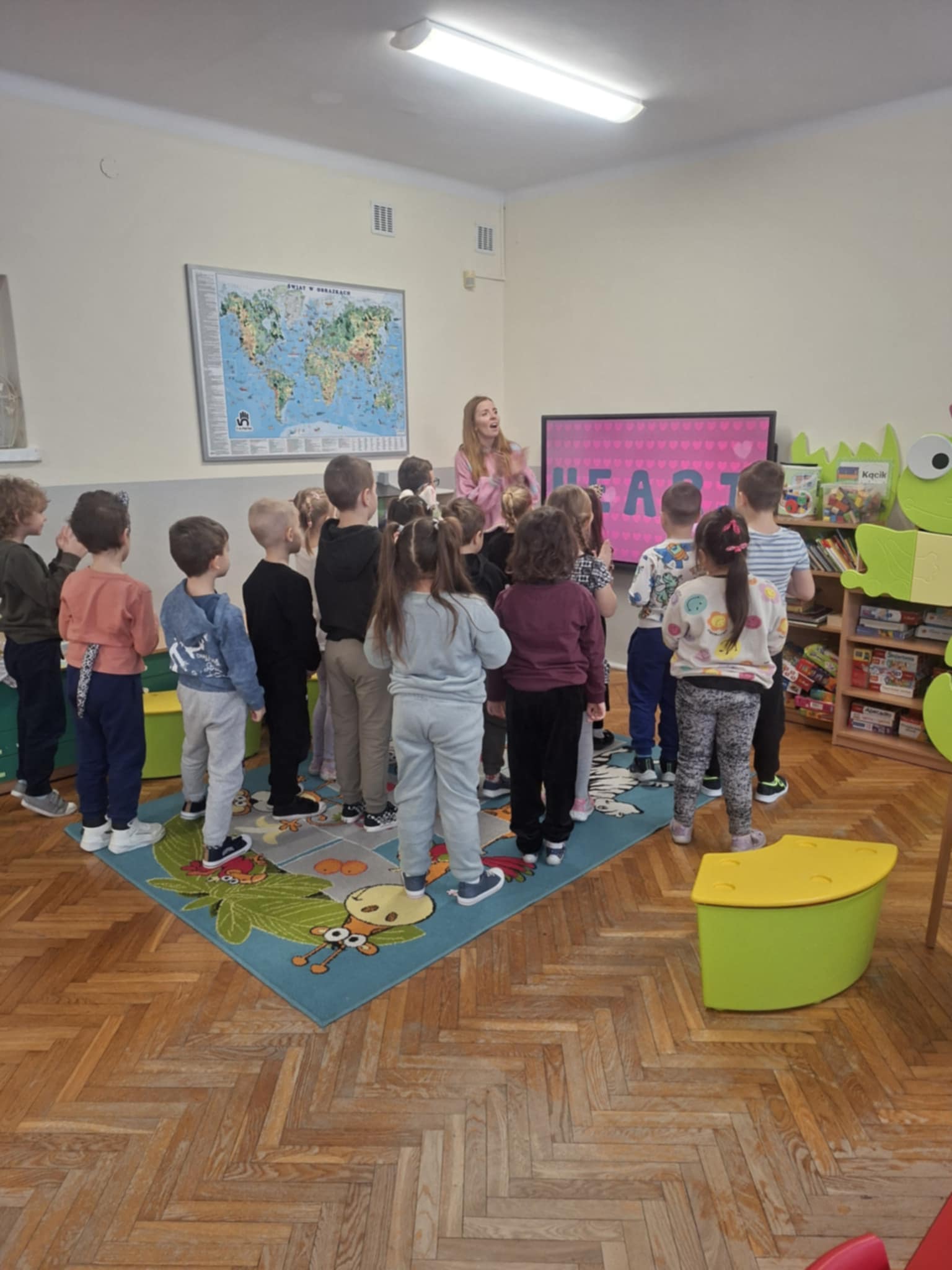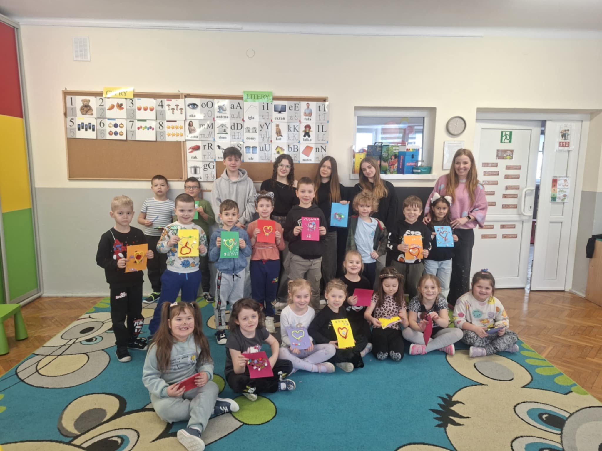 Z okazji Dnia Świętego Walentego uczniowie klasy 8a wraz z przedszkolnym nauczycielem języka angielskiego odwiedzili przedszkolaków, aby wspólnie świętować Valentine’s Day. Było to spotkanie pełne uśmiechu, życzliwości i dobrej energii. Podczas wizyty dzieci wysłuchały opowiadania pt. „Miłość”, wspólnie nauczyły się angielskiej piosenki „Heart”, ćwicząc przy tym literowanie w języku angielskim, a także przygotowały piękne kartki walentynkowe dla swoich rodziców. Starsi uczniowie pokazali, że nauka w szkole może być równie radosna i inspirująca jak czas spędzony w przedszkolu. Takie spotkania budują relacje, uczą współpracy i pokazują, że razem możemy więcej. Współpraca na linii SP9 i P5 to zdecydowanie współpraca na piątkę!