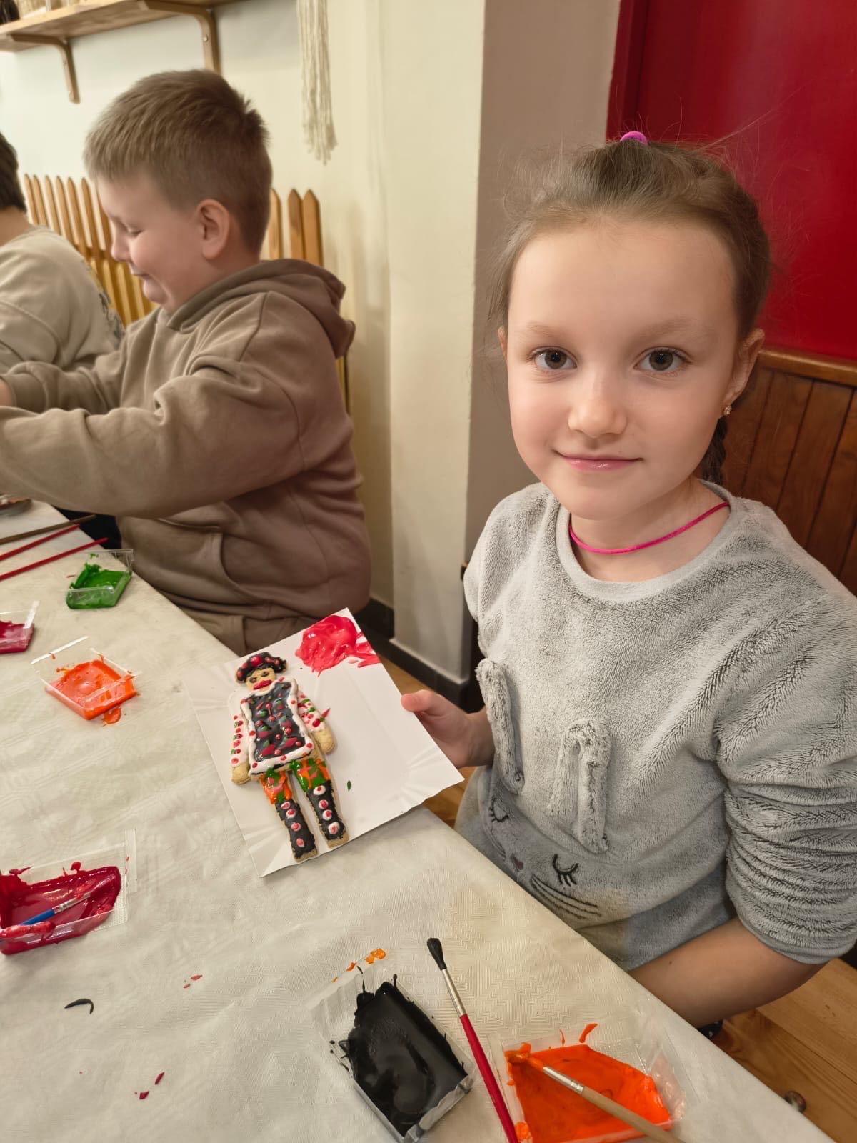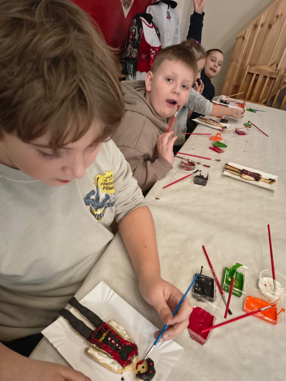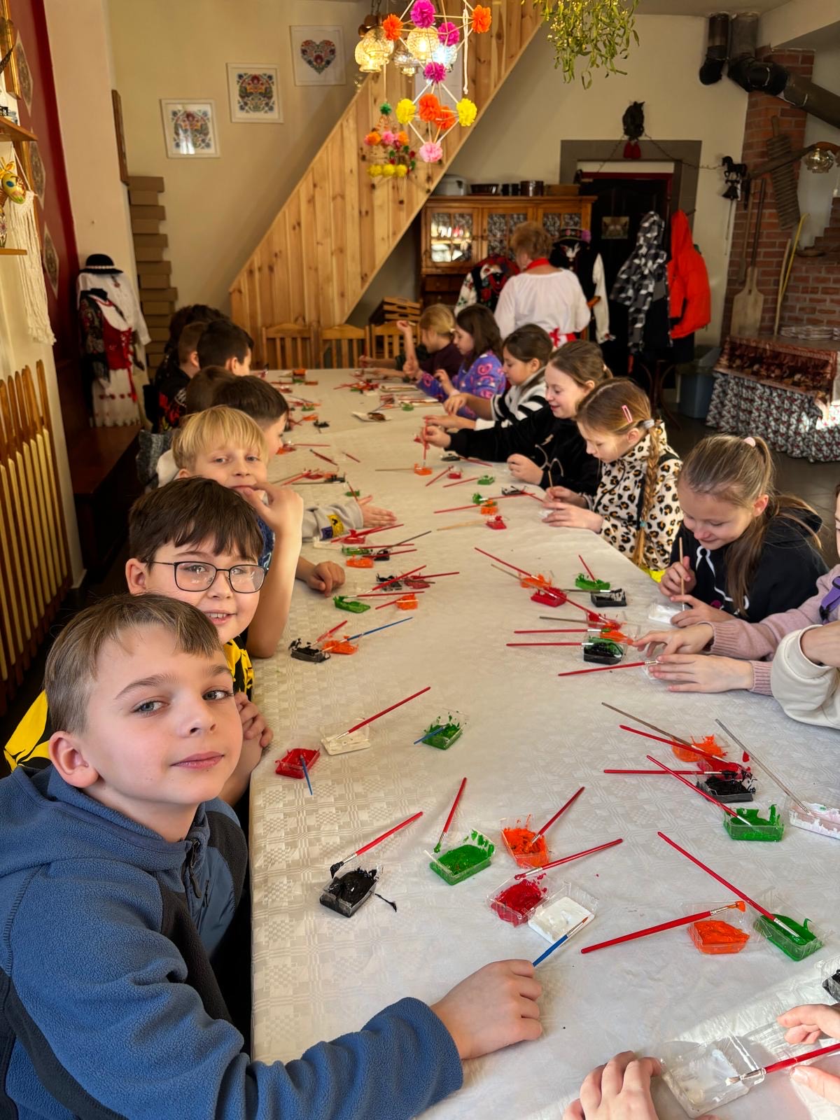 Klasy 2b i 3a kolejny raz odwiedziły Zagrodę Edukacyjną „Stajnia Lusi” w Konarzewie. Tym razem dzieci wzięły udział w warsztatach sztuki ludowej. Każdy mógł samodzielnie wykonać pająka, tradycyjną ozdobę regionu łowickiego oraz ubrać ciasteczkowe ludziki w stroje ludowe za pomocą kolorowego lukru. Było wspaniale!